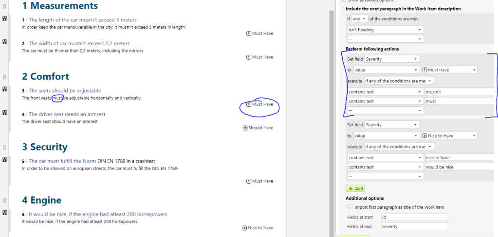 In order to set the severity already during import, you could say: If the words “Must & mustn’t” are contained in the requirement, then set the field severity directly to “must have”. This could look like this: