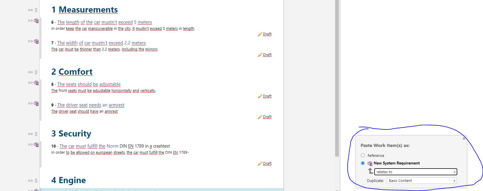 So lets start with copying the Customer Requirements to be our starting points in the System Specification. Therefore simply mark all the Customer Requirements in the first document, click ctrl + c and go to the new System Specification and click ctrl + v. – Basically no difference to copying between two word documents: