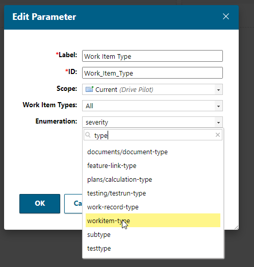 So I select “Enumeration” and there we have to select a name and id for the parameter. Under the field “Enumeration” we have access to all enumerations of the project. I select the enumeration “workitem-type”.