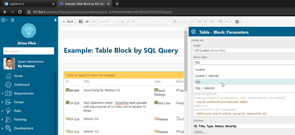 To check out the content of the SQL tables and test your queries, it makes sense to have a local Polarion. But it’s not necessary and you can try your SQL queries in Polarion widgets or filter bars.