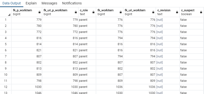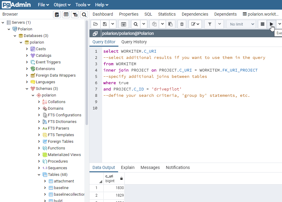 - “inner join PROJECT on PROJECT.C_URI = WORKITEM.FK_URI_POJECT” […] WHERE […] PROJECT.C_ID = ‘drivepilot’ – this part sets, that only Work Items of the project with the id “drivepilot” will be listed.