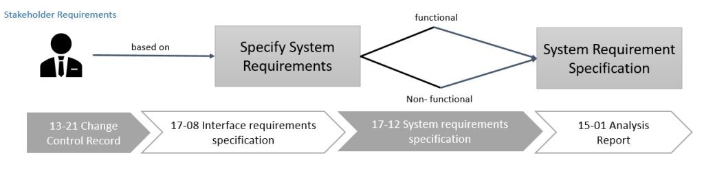 So, in a few words explained. We take our Stakeholder Requirements and identify based on that our functions and capabilities within System Requirements. After that we cluster them into functional and Non-functional and store them in a System Requirements Specification. Let´s try to draw it